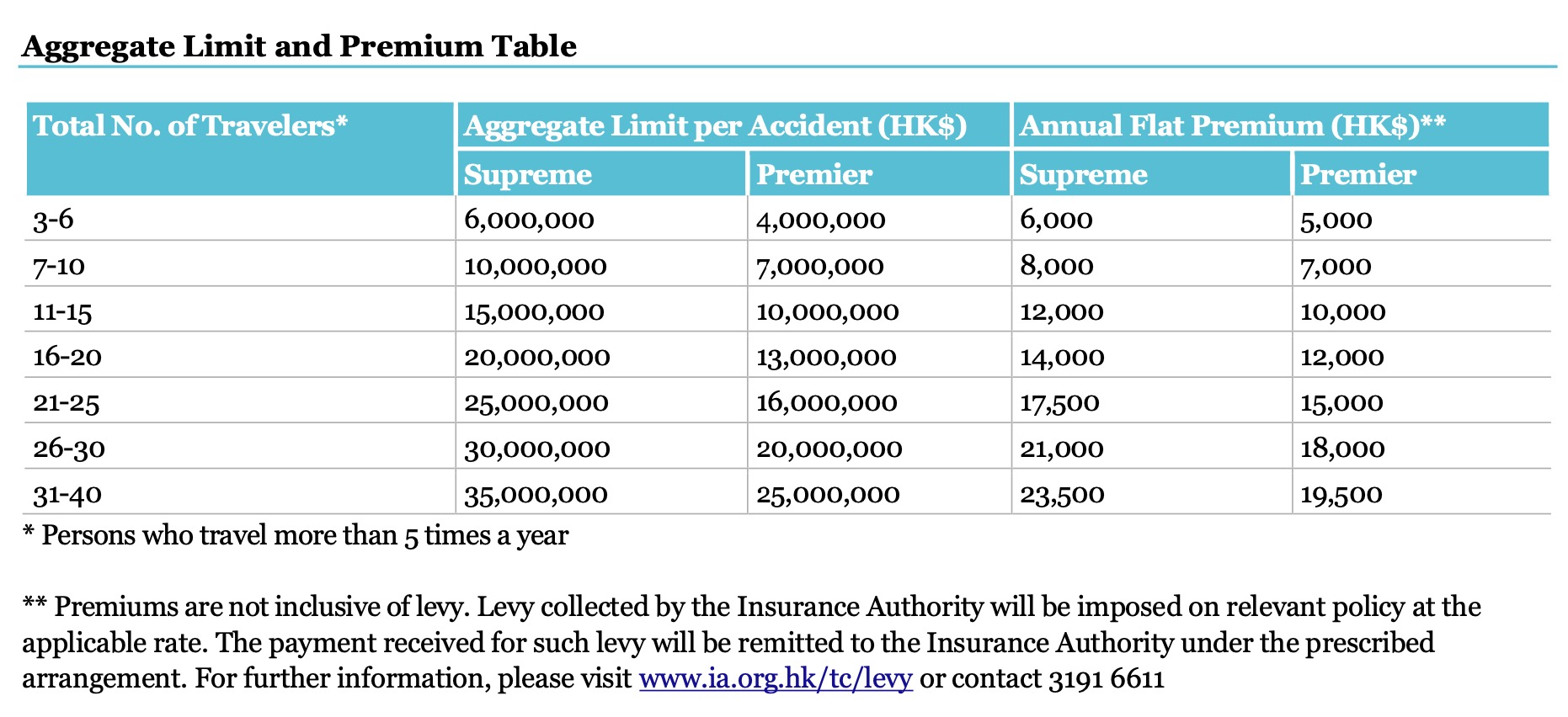 Chubb Insurance - Group Travel - Executive Travel Care - Rate Table
